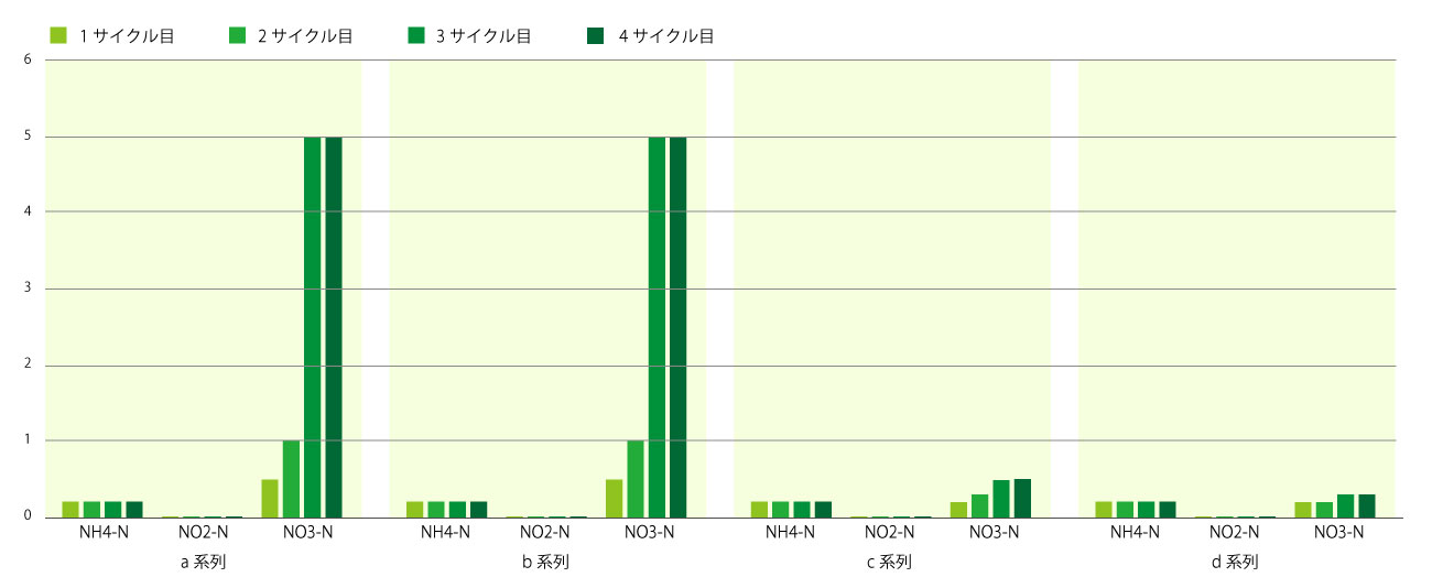 a~d系列においてアンモニウム態窒素、亜硝酸態窒素では大きな違いは見られませんでした。硝酸態窒素についてはa,b系列(尿素、窒素リン混合栄養剤添加区)においてサイクルを重ねるごとに硝酸が増加しています。これに比較し、a,b系列と同量の窒素量であるc系列(SANA-N添加区)の硝酸の増加は少ない傾向がみられました。