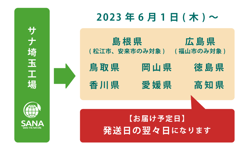 サナ埼玉工場→島根県(松江市、安来市のみ対象)、広島県(福山市のみ対象)、鳥取県、岡山県、徳島県、香川県、愛媛県、高知県
