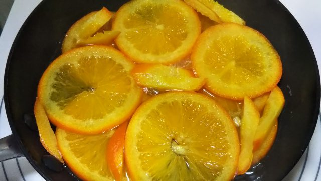 オレンジ100グラムに対して砂糖を80~100グラム、砂糖と同量の水を鍋で煮詰めていきます。
